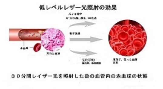 血管にレーザー光を照射し、光エネルギー効果とバイオ化学効果により細胞レベルでマイクロ還流を発生させ、糖質や油性でドロドロした血液の粘性を分解、糖質を削減、赤血球を自由にし、血液中の酸素濃度を高め、血液の循環を促進します。血液や血管に起因する病気、高血圧症、心臓と血管の病、心筋梗塞、脳血栓、脳梗塞等の予防や病院治療後に補助的に使用し効果があると期待されております。